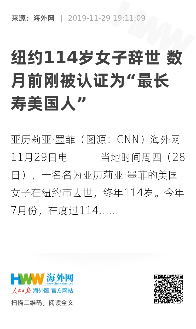 海外网11月29日电 当地时间周四(28日),一名名为亚历莉亚·墨菲的美国女子在纽约市去世,终年114岁。今年7月份,在度过114岁生日后,亚历莉亚·墨菲被老年学研究组织(GRG)认证为“最长寿的美国人”。
