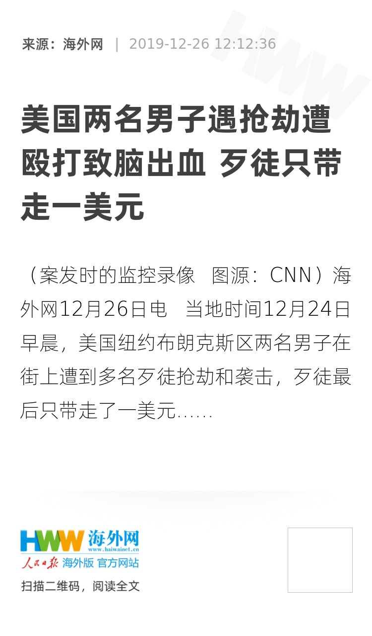 海外网12月26日电 当地时间12月24日早晨,美国纽约布朗克斯区两名男子在街上遭到多名歹徒抢劫和袭击,歹徒最后只带走了一美元,一名受害人却面临生命危险。