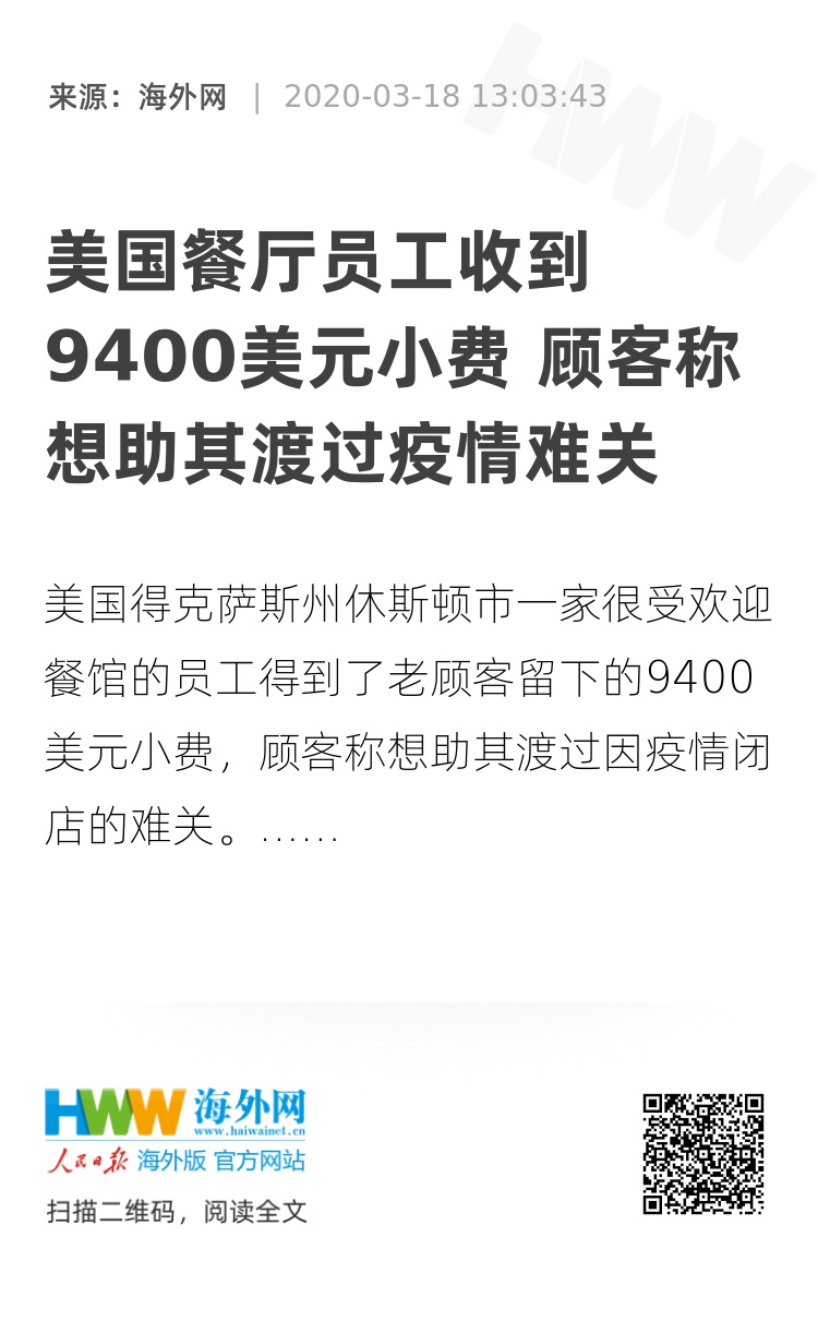 【海外网3月18日|战疫全时区】美国得克萨斯州休斯顿市一家很受欢迎餐馆的员工得到了老顾客留下的9400美元(约合人民币65854元)小费,顾客称想助其渡过因疫情闭店的难关。餐厅店长表示,餐馆将开通外卖服务继续营业以支持店员并为社区提供服务。