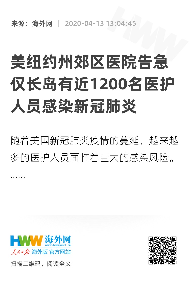 【海外网4月13日|战疫全时区】当地时间4月11日,纽约州发布的一份报告显示,仅长岛地区已有近1200名医护人员感染新冠肺炎,确诊数量“十分惊人”。
