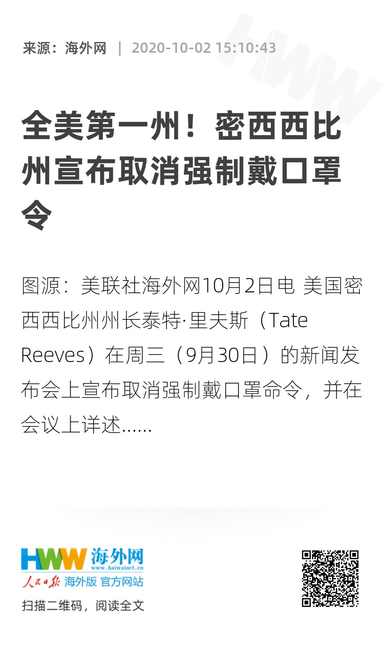 海外网10月2日电 美国密西西比州州长泰特·里夫斯(Tate Reeves)在周三(9月30日)的新闻发布会上宣布取消强制戴口罩命令,并在会议上详述了一项放宽社交距离限制的新行政命令。美媒称,密西西比州由此成为美国第一个取消强制戴口罩令的州。