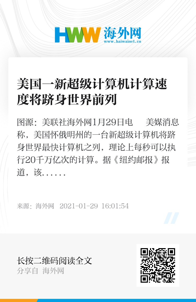 海外网1月29日电 美媒消息称,美国怀俄明州的一台新超级计算机将跻身世界最快计算机之列,理论上每秒可以执行20千万亿次的计算。