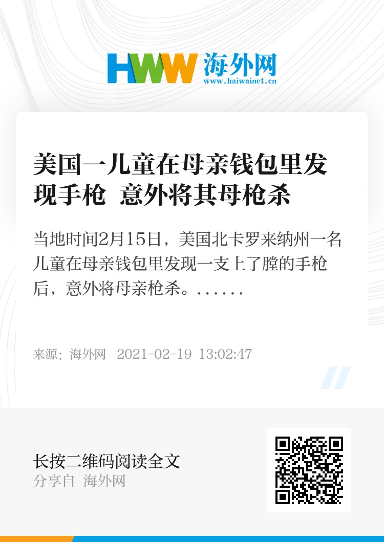 海外网2月19日电 当地时间2月15日,美国北卡罗来纳州一名儿童在母亲钱包里发现一支上了膛的手枪后,意外将母亲枪杀。