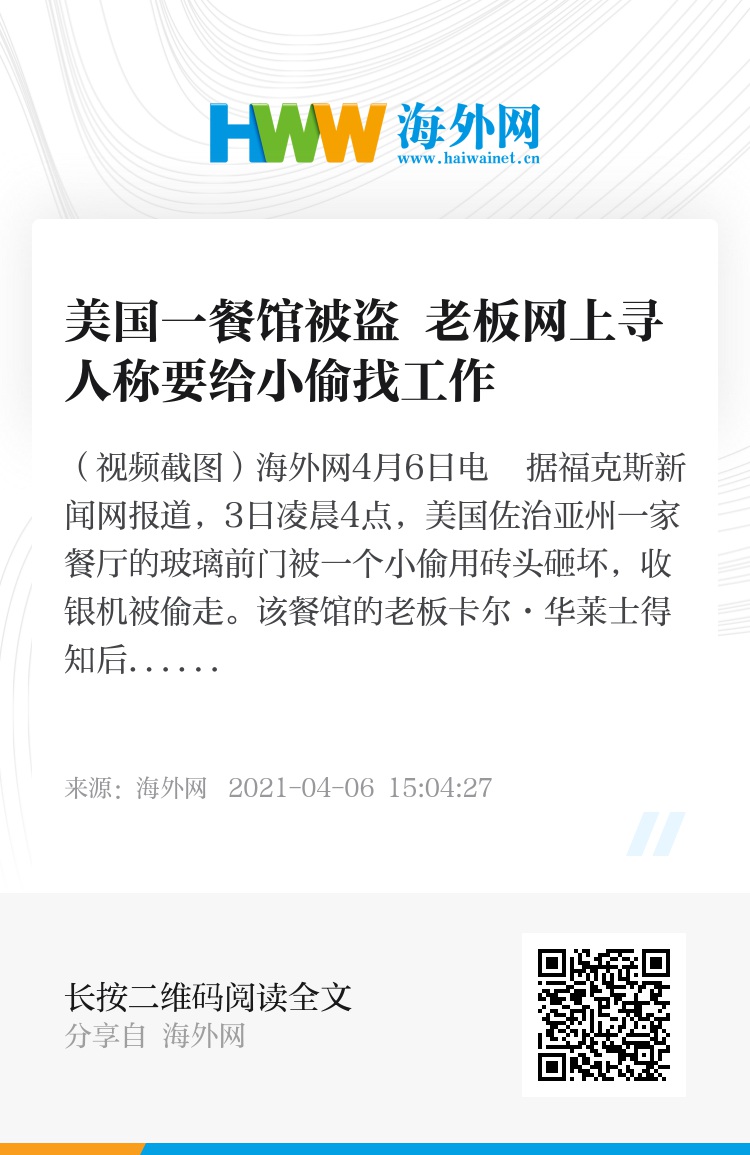 海外网4月6日电 据福克斯新闻网报道,3日凌晨4点,美国佐治亚州一家餐厅的玻璃前门被一个小偷用砖头砸坏,收银机被偷走。该餐馆的老板卡尔·华莱士得知后,却在社交媒体上邀请这名小偷去餐馆求职,并留下了手机号码。