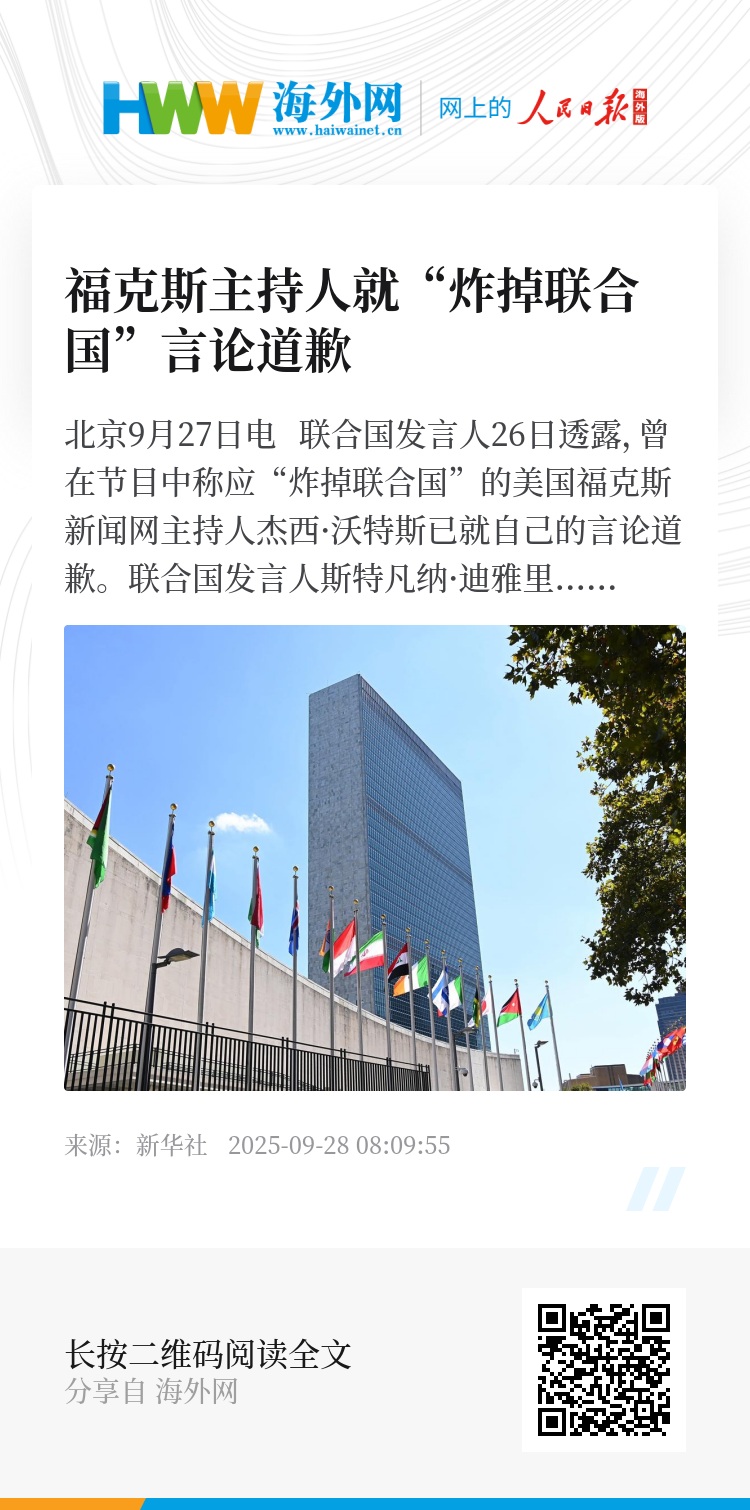 新华社北京9月27日电 联合国发言人26日透露,曾在节目中称应“炸掉联合国”的美国福克斯新闻网主持人杰西·沃特斯已就自己的言论道歉。