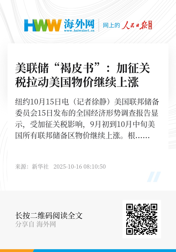 新华社纽约10月15日电(记者徐静)美国联邦储备委员会15日发布的全国经济形势调查报告显示,受加征关税影响,9月初到10月中旬美国所有联邦储备区物价继续上涨。