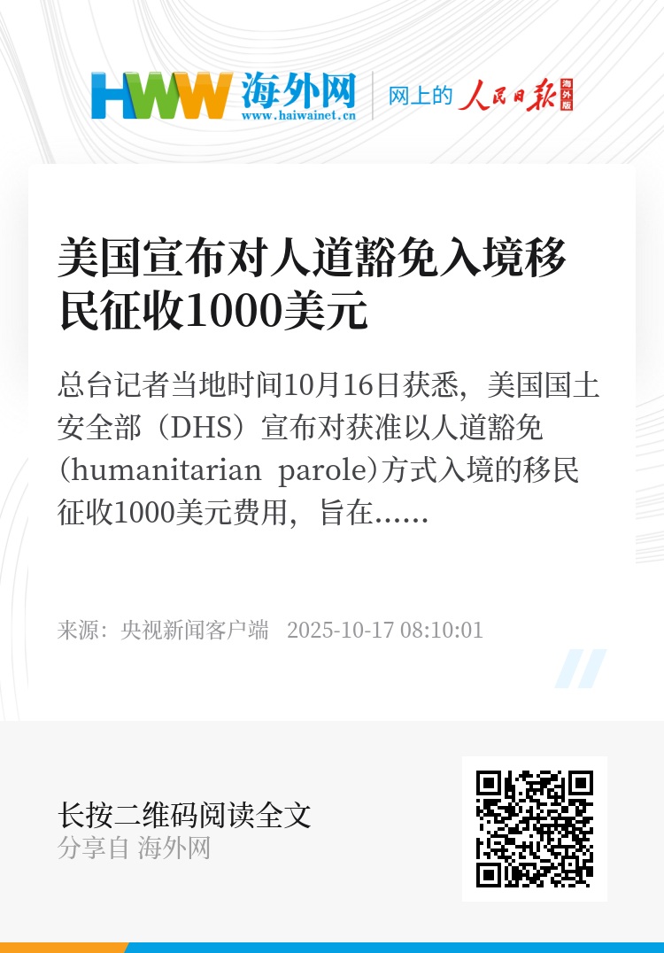 总台记者当地时间10月16日获悉,美国国土安全部(DHS)宣布对获准以人道豁免(humanitarian parole)方式入境的移民征收1000美元费用,旨在“强化问责、防止滥用及改善监督机制”。