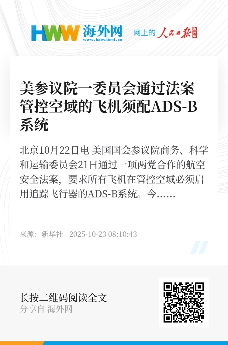 新华社北京10月22日电 美国国会参议院商务、科学和运输委员会21日通过一项两党合作的航空安全法案,要求所有飞机在管控空域必须启用追踪飞行器的ADS-B系统。今年1月,美国一架客机与陆军直升机相撞后坠河,造成67人死亡,事发时直升机未启用该系统。