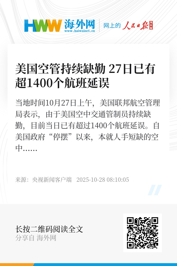 当地时间10月27日上午,美国联邦航空管理局表示,由于美国空中交通管制员持续缺勤,目前当日已有超过1400个航班延误。