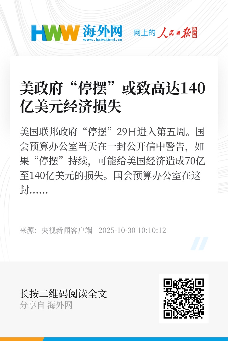 国会预算办公室在这封信中向国会众议院预算委员会主席报告,根据政府“停摆”持续时间长短,预计“停摆”将使美国今年四季度实际国内生产总值的年化增长率下降1至2个百分点,估计“将有70亿至140亿美元经济产出损失无法恢复”。