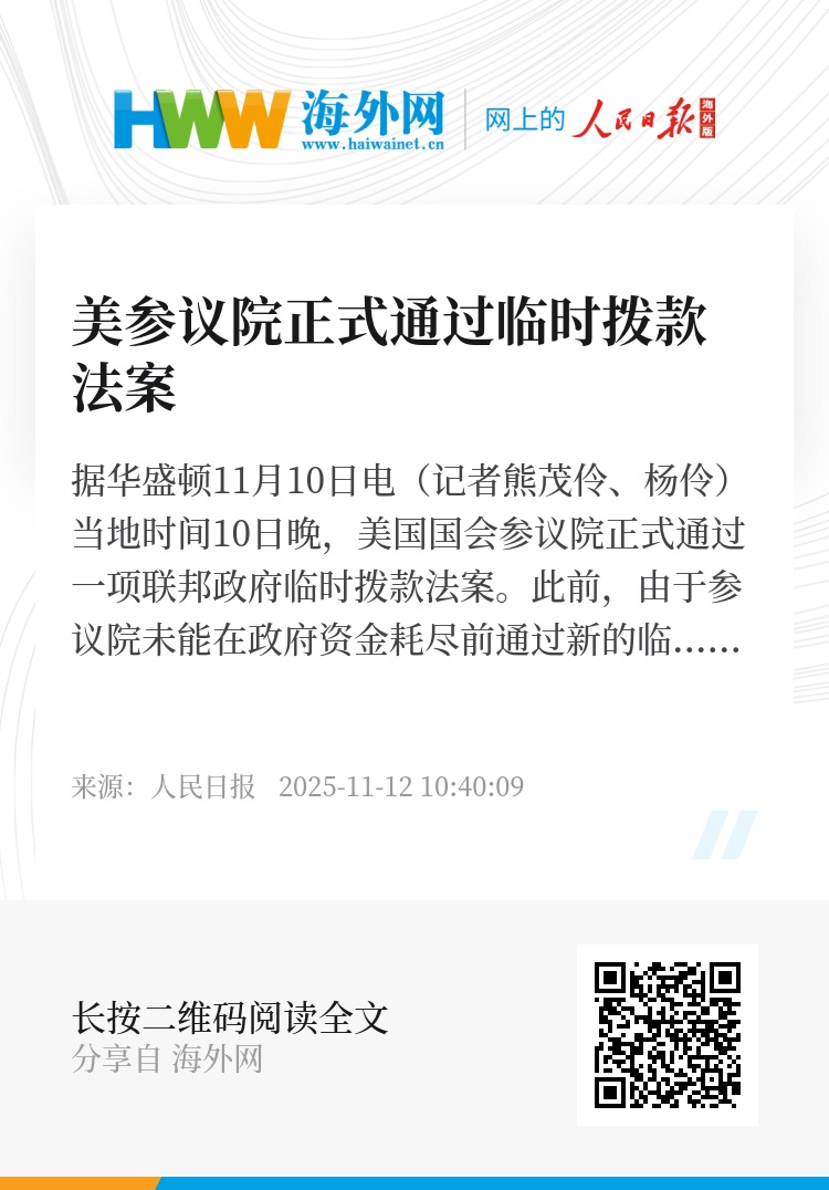 据新华社华盛顿11月10日电(记者熊茂伶、杨伶)当地时间10日晚,美国国会参议院正式通过一项联邦政府临时拨款法案。此前,由于参议院未能在政府资金耗尽前通过新的临时拨款法案,美国联邦政府从10月1日开始“停摆”,截至11月10日已达创纪录的41天。这一法案根据众议院此前通过的版本修订而成,经参议院通过后,仍需众议院批准并送交总统签署,方能最终化解美国联邦政府“停摆”僵局。