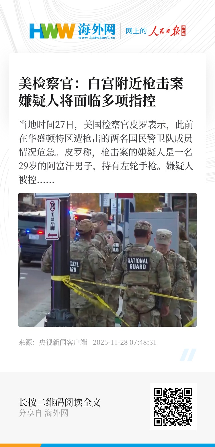 美国两名国民警卫队成员26日在白宫附近遭到枪击,伤情严重。美国警方表示,嫌疑人已被抓获。美国多名执法官员此前称,枪击两名国民警卫队成员的嫌疑人是29岁的阿富汗公民拉赫曼努拉·拉坎瓦尔,他于2021年进入美国。(央视记者 吴汉婴)