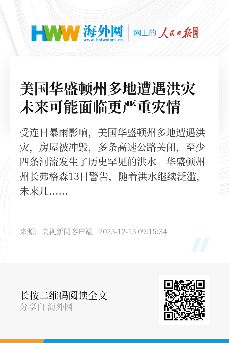 华盛顿州州长弗格森13日警告,随着洪水继续泛滥,未来几周乃至几个月,华盛顿州将面临更严重的灾情。目前,华盛顿州已进入紧急状态。