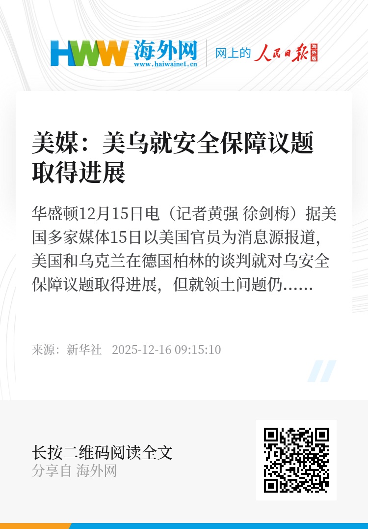 新华社华盛顿12月15日电(记者黄强 徐剑梅)据美国多家媒体15日以美国官员为消息源报道,美国和乌克兰在德国柏林的谈判就对乌安全保障议题取得进展,但就领土问题仍存分歧。