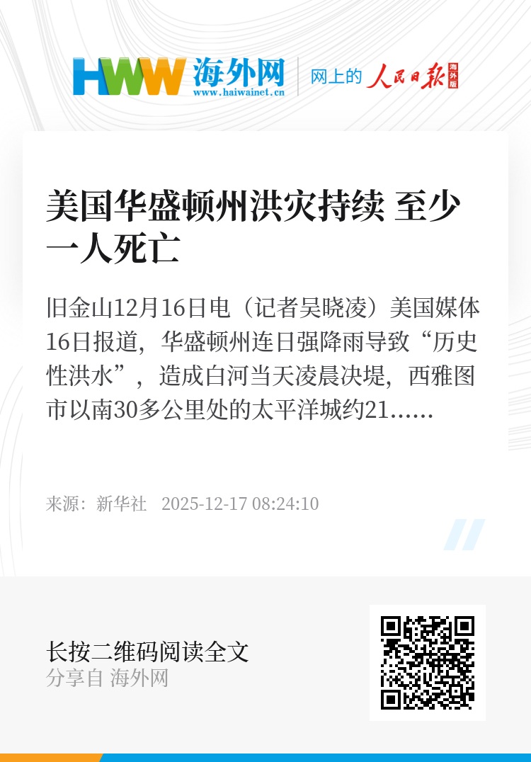 新华社旧金山12月16日电(记者吴晓凌)美国媒体16日报道,华盛顿州连日强降雨导致“历史性洪水”,造成白河当天凌晨决堤,西雅图市以南30多公里处的太平洋城约2100名居民接到紧急疏散命令。另外,洪水在斯诺霍米什县导致一人死亡。