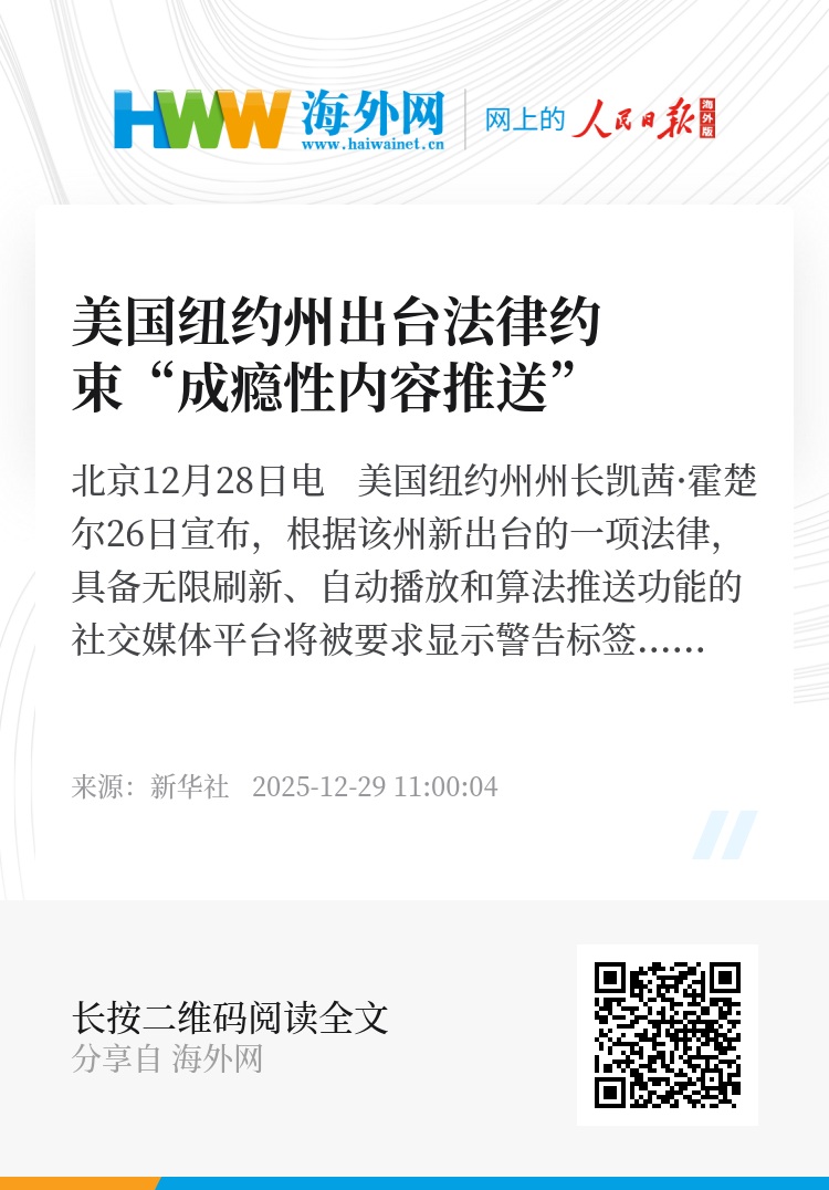 新华社北京12月28日电 美国纽约州州长凯茜·霍楚尔26日宣布,根据该州新出台的一项法律,具备无限刷新、自动播放和算法推送功能的社交媒体平台将被要求显示警告标签,提示其对青少年心理健康的潜在危害。