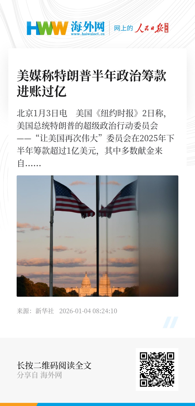 新华社北京1月3日电 美国《纽约时报》2日称,美国总统特朗普的超级政治行动委员会——“让美国再次伟大”委员会在2025年下半年筹款超过1亿美元,其中多数献金来自富人以及有求于特朗普政府的人。