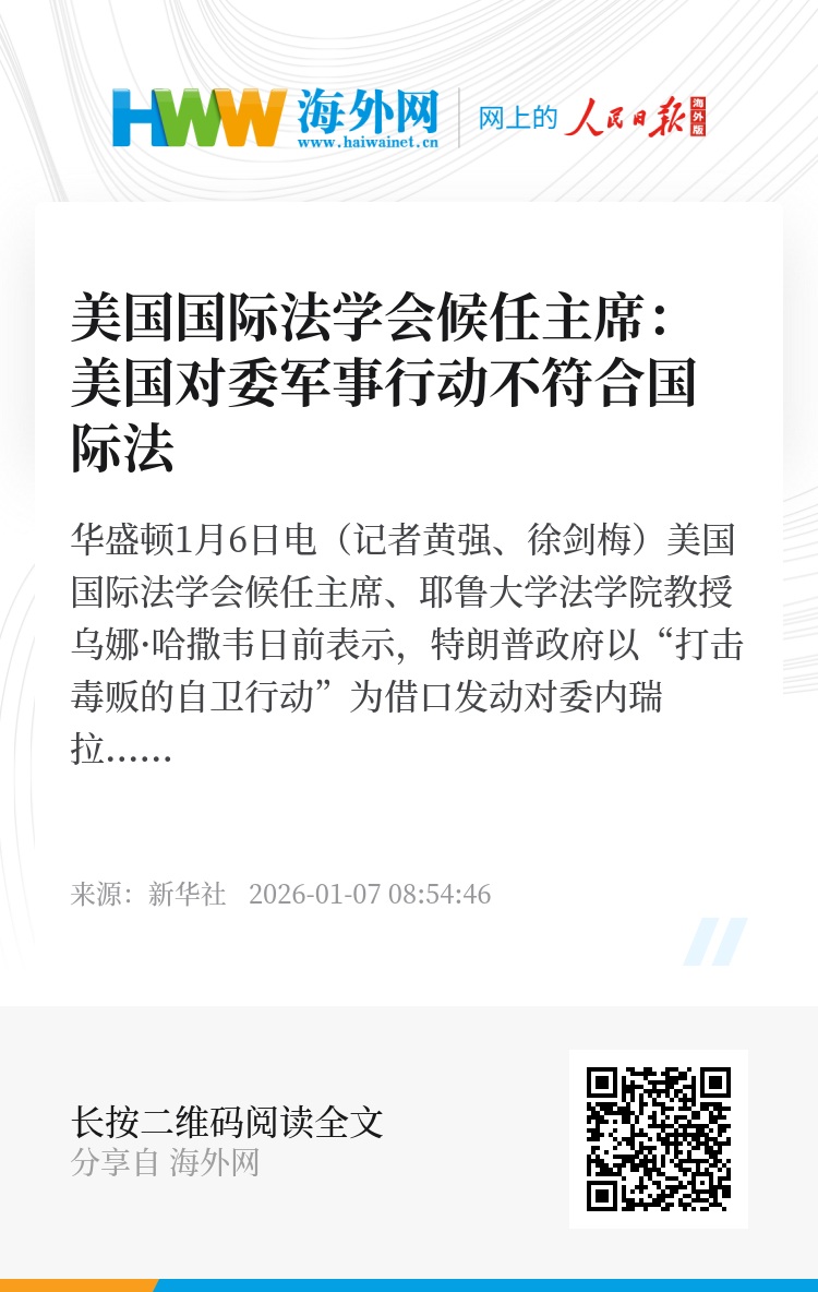 新华社华盛顿1月6日电(记者黄强、徐剑梅)美国国际法学会候任主席、耶鲁大学法学院教授乌娜·哈撒韦日前表示,特朗普政府以“打击毒贩的自卫行动”为借口发动对委内瑞拉军事行动缺乏法律依据,不符合国际法。