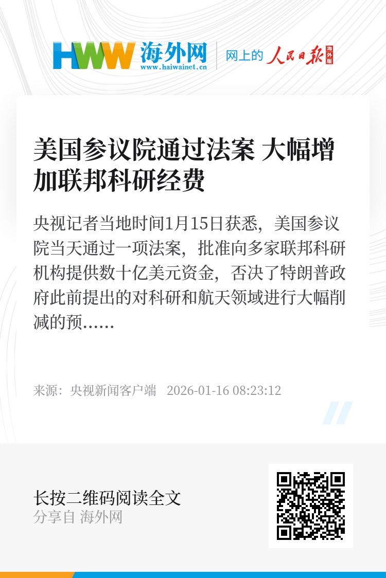 央视记者当地时间1月15日获悉,美国参议院当天通过一项法案,批准向多家联邦科研机构提供数十亿美元资金,否决了特朗普政府此前提出的对科研和航天领域进行大幅削减的预算方案。