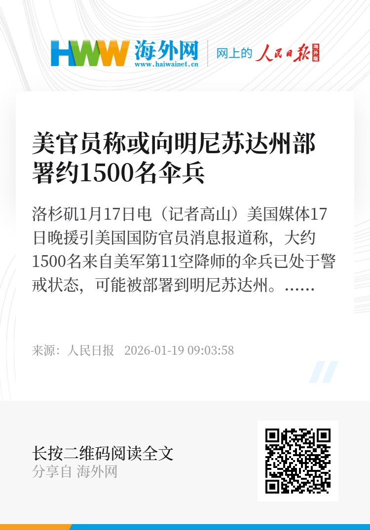新华社洛杉矶1月17日电(记者高山)美国媒体17日晚援引美国国防官员消息报道称,大约1500名来自美军第11空降师的伞兵已处于警戒状态,可能被部署到明尼苏达州。