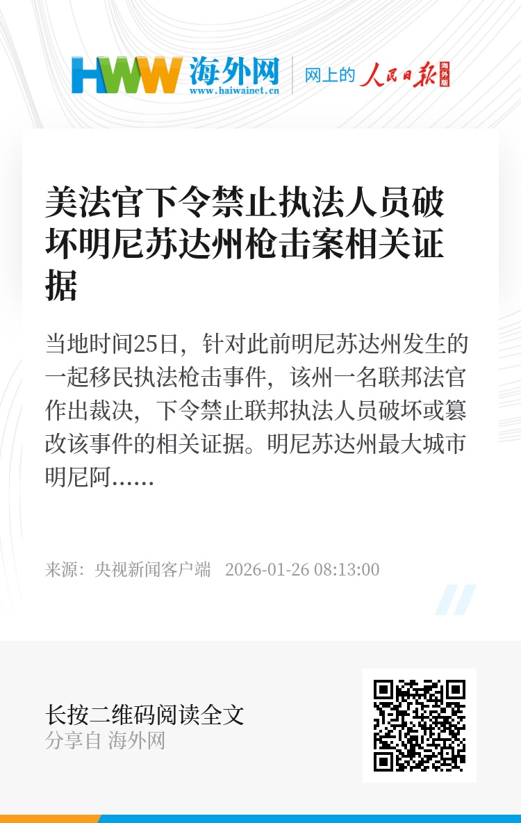 当地时间25日,针对此前明尼苏达州发生的一起移民执法枪击事件,该州一名联邦法官作出裁决,下令禁止联邦执法人员破坏或篡改该事件的相关证据。