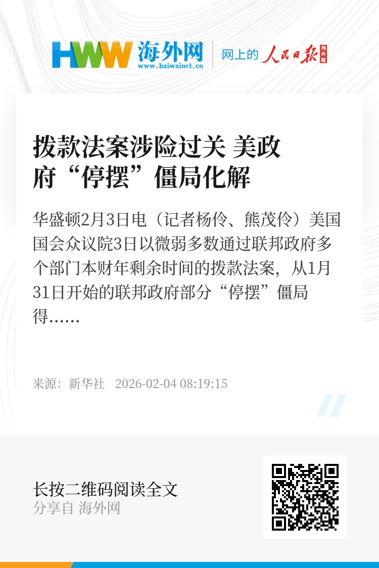 新华社华盛顿2月3日电(记者杨伶、熊茂伶)美国国会众议院3日以微弱多数通过联邦政府多个部门本财年剩余时间的拨款法案,从1月31日开始的联邦政府部分“停摆”僵局得以化解。共和党籍总统特朗普稍后签署这一法案。