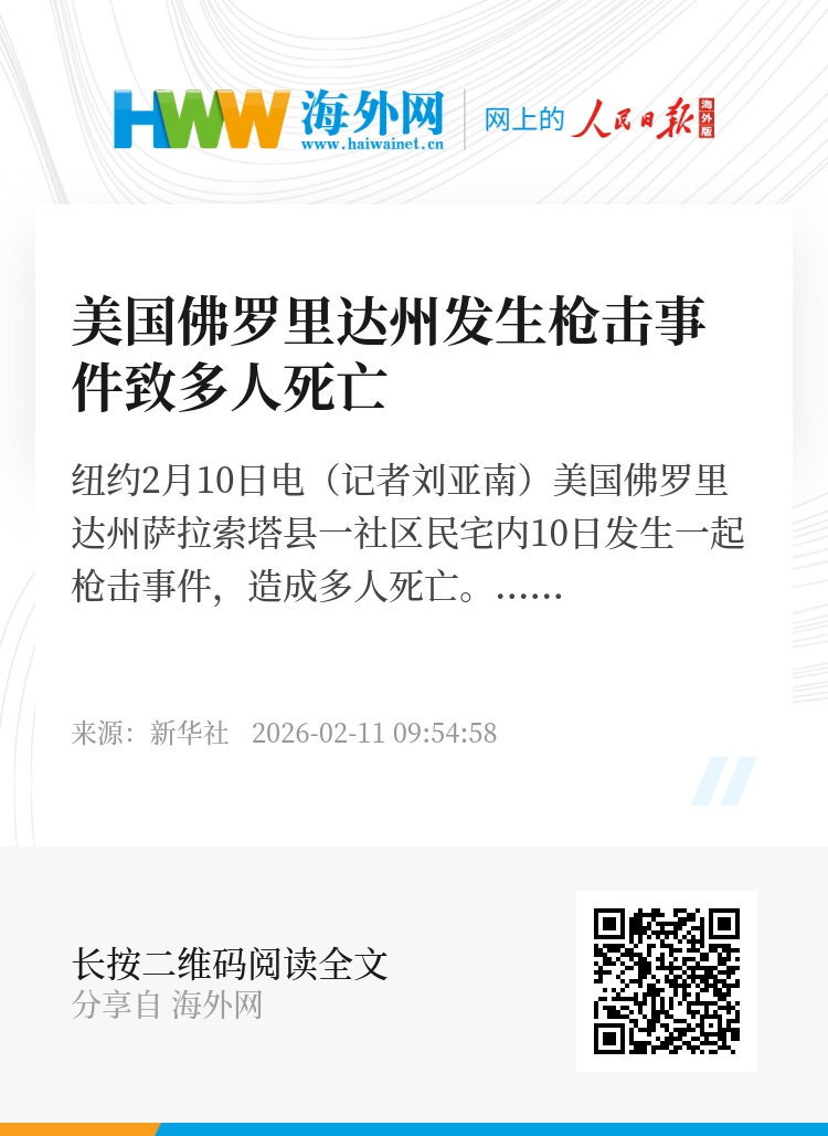 新华社纽约2月10日电(记者刘亚南)美国佛罗里达州萨拉索塔县一社区民宅内10日发生一起枪击事件,造成多人死亡。