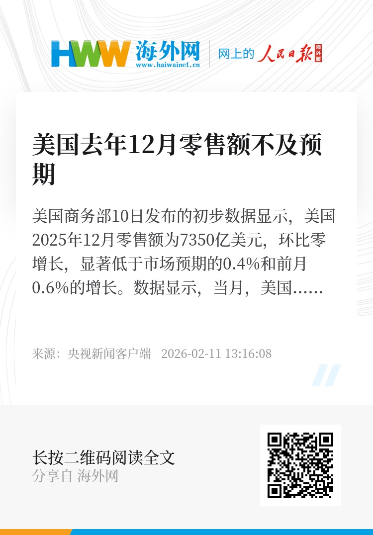 美国商务部10日发布的初步数据显示,美国2025年12月零售额为7350亿美元,环比零增长,显著低于市场预期的0.4%和前月0.6%的增长。