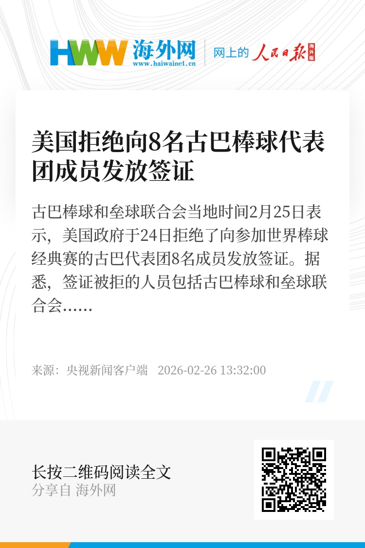 古巴棒球和垒球联合会当地时间2月25日表示,美国政府于24日拒绝了向参加世界棒球经典赛的古巴代表团8名成员发放签证。