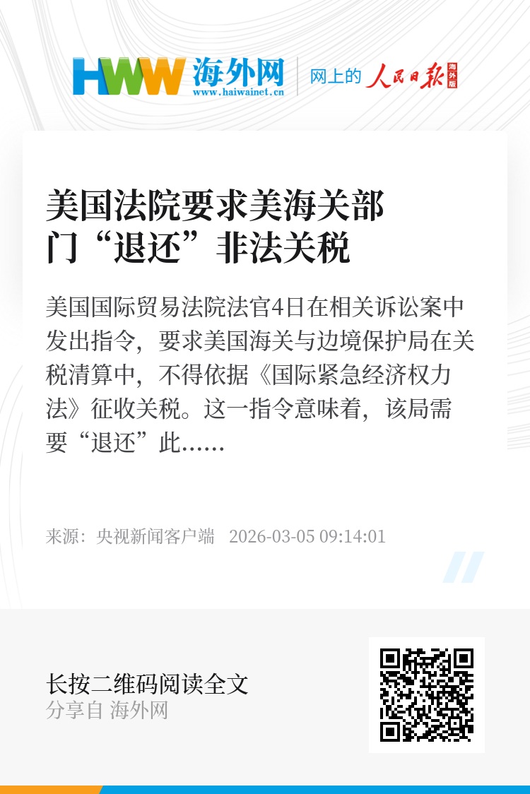 美国国际贸易法院法官4日在相关诉讼案中发出指令,要求美国海关与边境保护局在关税清算中,不得依据《国际紧急经济权力法》征收关税。这一指令意味着,该局需要“退还”此前依据《国际紧急经济权力法》征收的关税。