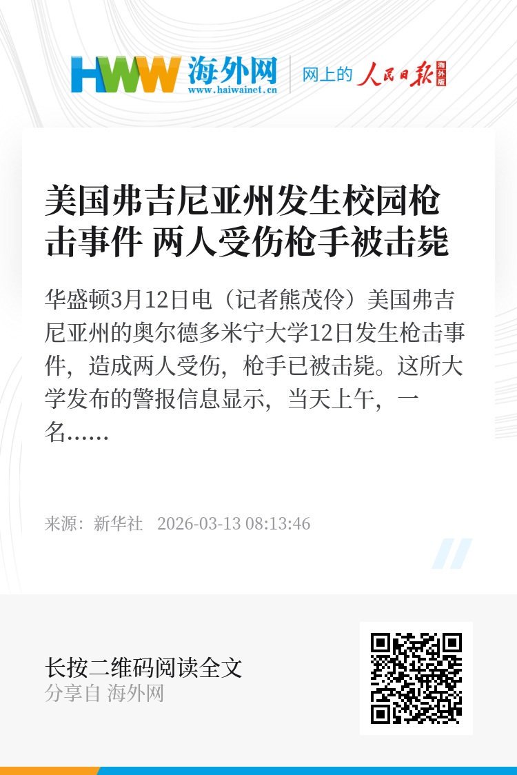 新华社华盛顿3月12日电(记者熊茂伶)美国弗吉尼亚州的奥尔德多米宁大学12日发生枪击事件,造成两人受伤,枪手已被击毙。