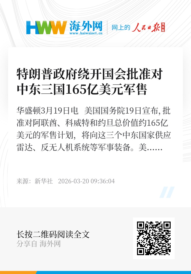 新华社华盛顿3月19日电 美国国务院19日宣布,批准对阿联酋、科威特和约旦总价值约165亿美元的军售计划,将向这三个中东国家供应雷达、反无人机系统等军事装备。