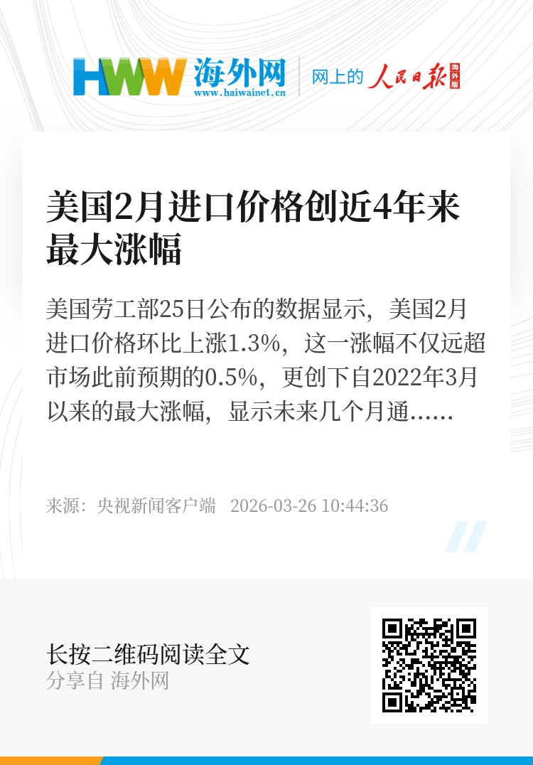美国劳工部25日公布的数据显示,美国2月进口价格环比上涨1.3%,这一涨幅不仅远超市场此前预期的0.5%,更创下自2022年3月以来的最大涨幅,显示未来几个月通胀上行压力或将进一步加大。
