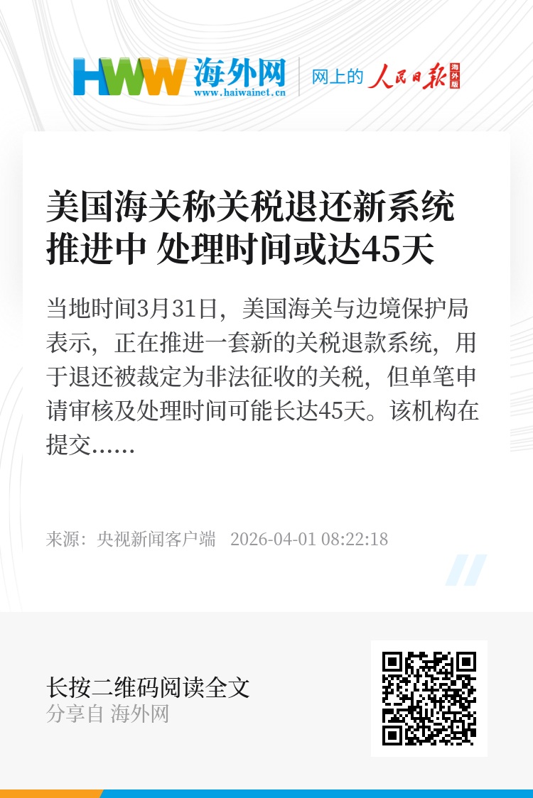 当地时间3月31日,美国海关与边境保护局表示,正在推进一套新的关税退款系统,用于退还被裁定为非法征收的关税,但单笔申请审核及处理时间可能长达45天。