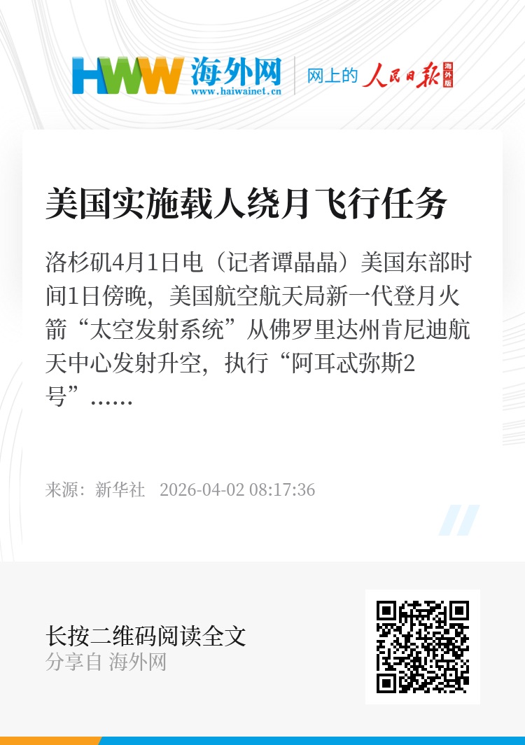新华社洛杉矶4月1日电(记者谭晶晶)美国东部时间1日傍晚,美国航空航天局新一代登月火箭“太空发射系统”从佛罗里达州肯尼迪航天中心发射升空,执行“阿耳忒弥斯2号”载人绕月飞行任务。这是美国自1972年以来首次载人飞向月球。