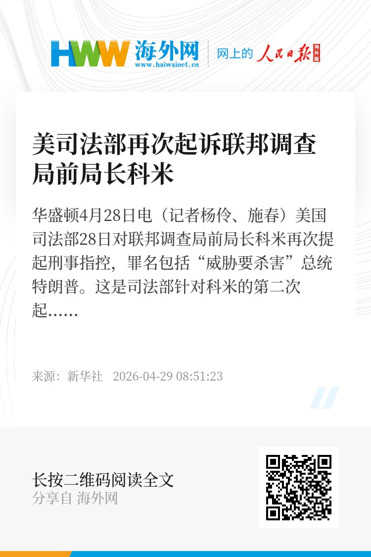新华社华盛顿4月28日电(记者杨伶、施春)美国司法部28日对联邦调查局前局长科米再次提起刑事指控,罪名包括“威胁要杀害”总统特朗普。这是司法部针对科米的第二次起诉。